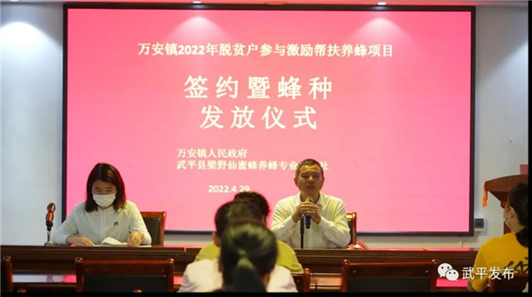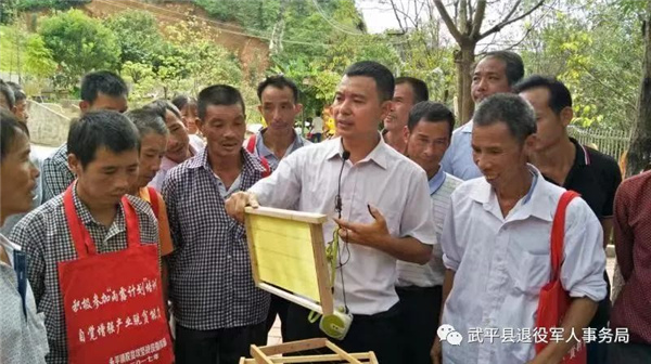 编者按 退役军人是重要的人力资源,促进他们就业创业、引导他们积极投身创业创新,对于更好实现退役军人自身价值、助推经济社会发展、服务国防和军队建设具有重要意义。为贯彻执行好省退役军人厅关于《进一步促进退役军人就业创业十条措施》,3月17日起,厅官微官网开设“创业先锋”专栏,陆续报道我省退役军人秉持军人本色奋斗在经济建设主战场的创业典型,宣传社会各界关心支持退役军人就业创业的动人故事,以此弘扬自信自强、积极向上的精神风貌,营造有利于退役军人就业创业的良好氛围。 近日,武平县万安镇2022年脱贫户参与激励帮扶养蜂项目签约暨蜂种发放仪式在石燎阁蜜蜂科普基地举行,基地负责人退役老兵钟亮生为10位帮扶脱贫户现场颁发了蜜蜂认养证书,并指导他们做好蜜蜂日常管理。