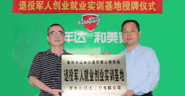 追梦路上,军旅情怀一路伴跑 张志芳对部队一直有着深厚的感情,百年达也始终把退役军人放在突出位置,积极扶持退役军人就业创业。公司现有退役军人员工26人,其中副团职自主择业退役军官3人,扶持退役军人创业28人,安排退役军人就业300多人,在现有几十位退伍军人经销商、员工的基础上,还在继续壮大退役军人团队,公司所有岗位招聘时优先录用退役军人。对创业的退役军人在政策上和经济上给予大力扶助,长年全程免费技术培训,全国300多家代理专卖店,其中公司特殊扶持的退役军人创业代理店占三分之一。企业完善独特军旅企业文化,设有退役军人之家,定期组织员工进行基本军事训练,开展爱党、爱国、拥军教育活动。 2020年6月,公司获“退役军人创业创新大赛一等奖”,张志芳个人获得全国退役军人创业先锋称号,受聘为福建省退役军人事务厅创业导师团成员。2020年11月,公司作为当地政府“退役军人就业创业实训基地”,在退役军人就业创业事业上承载了更多更远的梦想。 |