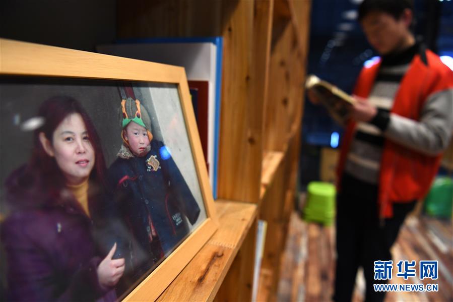 11月25日,俊俊在看书。相框里是他4岁时和阜阳市艾滋病贫困儿童救助协会负责人张颖的合影。 新华社记者刘军喜摄