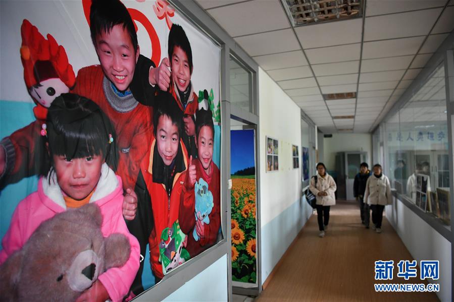 俊俊在看属于自己的卡通形象(2013年11月27日摄)。他的卡通形象由协会老师根据他的特征而绘制。 新华社记者刘军喜摄