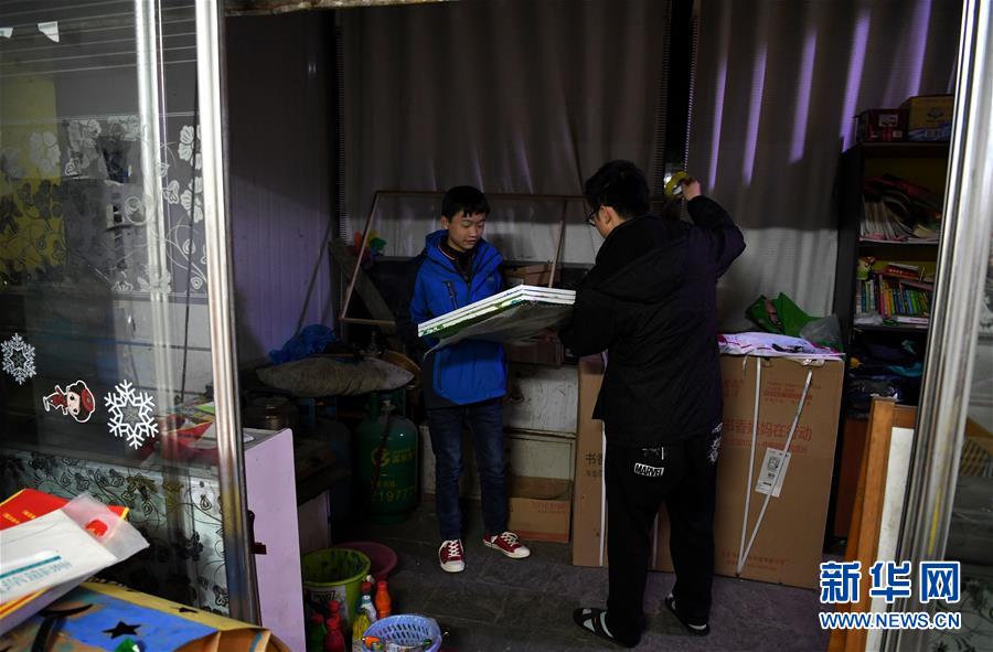 俊俊(左)在打包自己的绘画作品,准备去北京参加画展(2017年11月26日摄)。 新华社记者刘军喜摄