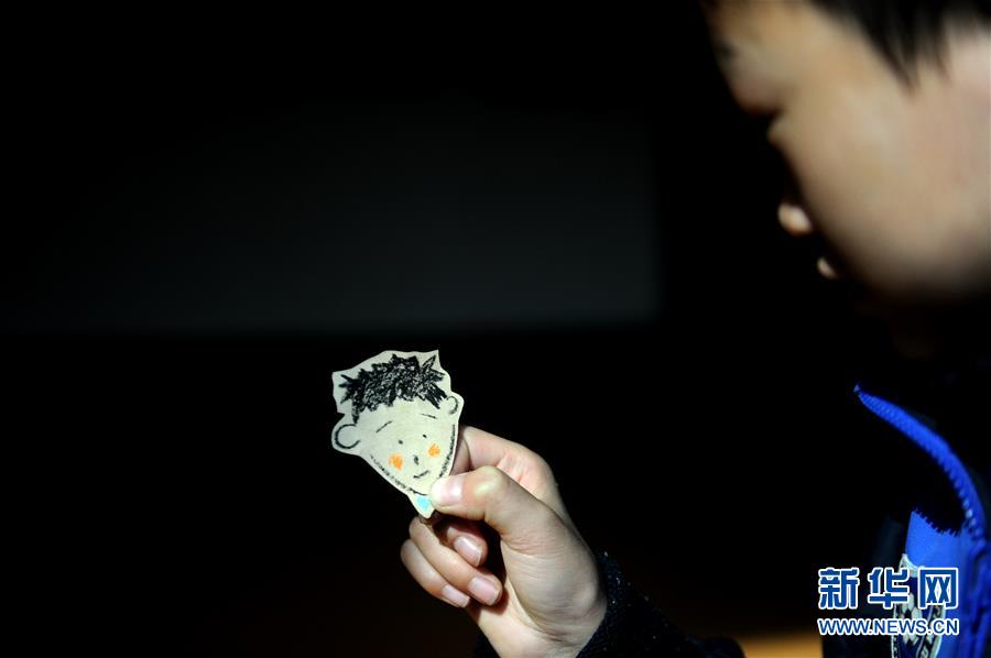 俊俊在看属于自己的卡通形象(2013年11月27日摄)。他的卡通形象由协会老师根据他的特征而绘制。 新华社记者刘军喜摄