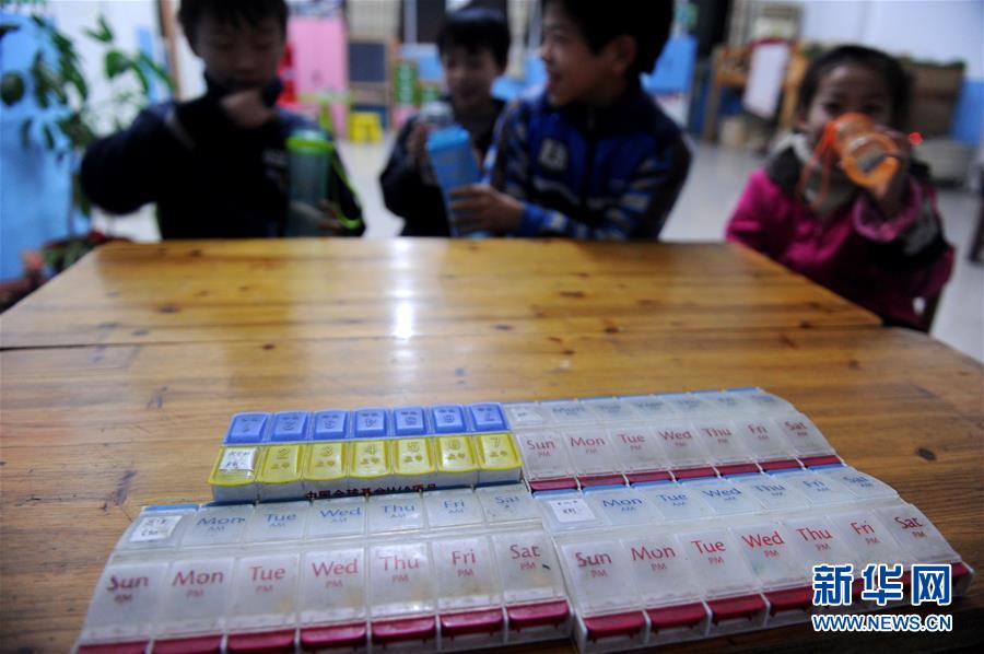 俊俊(左一)和小伙伴在吃药(2013年11月26日摄)。 新华社记者刘军喜摄
