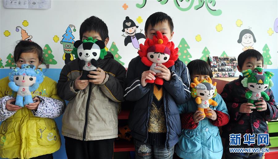 俊俊(中)和小伙伴们在房间里展示北京奥运吉祥物玩偶(2011年11月30日摄)。这些年来,陪在俊俊身边的还有4名形影不离的小伙伴,他们跟俊俊一样经母婴传播感染了艾滋病毒,最后因为父母离世或被父母遗弃而成为孤儿。 新华社记者刘军喜摄