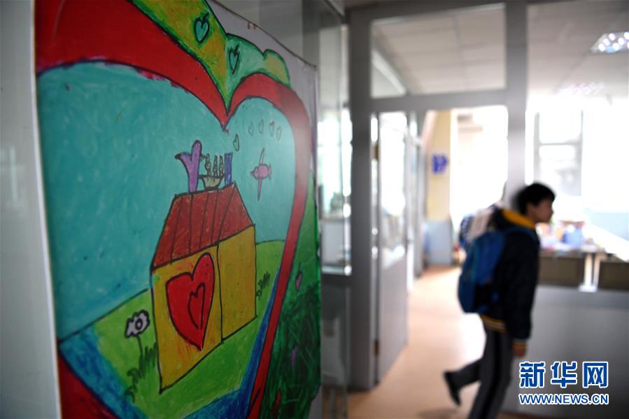 11月26日,阜阳市艾滋病贫困儿童救助协会办公室的玻璃门上贴着俊俊2012年的绘画作品。 新华社记者张端摄
