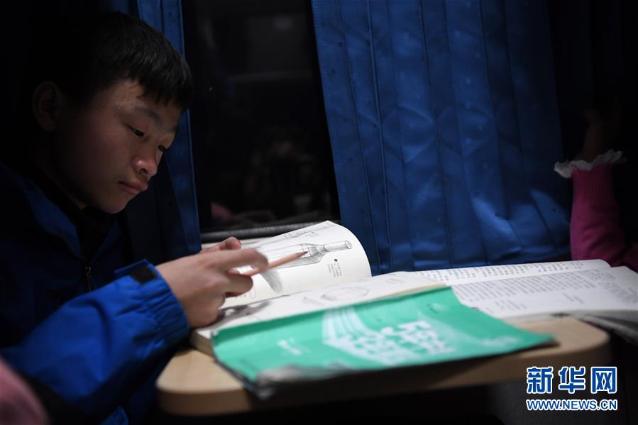 俊俊在阜阳开往北京的列车上学习,他受邀到北京参加艾滋病日宣传活动(2017年11月26日摄)。 新华社记者刘军喜摄