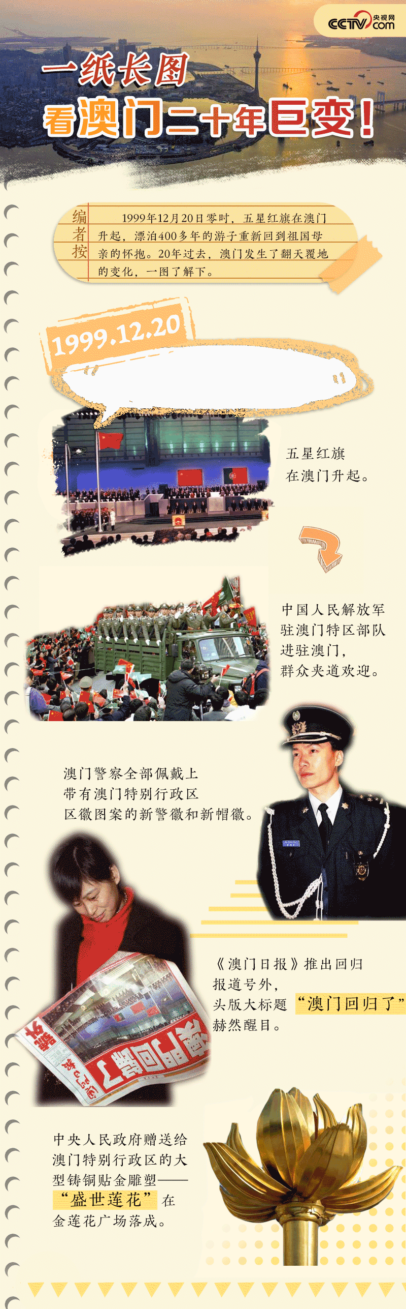2019-12-15 14:45:45 来源:央视网 责任编辑:蔡秀明 作者:央视网消息:时光飞逝,澳门回归祖国已二十载。 人口67.6万,面积32.8平方公里,从规模上看,澳门只是“弹丸之地”,人力有限、土地有限、资源有限…… 然而,在祖国的强力支持下,澳门从容应对危机和考验,在曲折坎坷中一次次华丽变身,不断前行。昔日连续4年经济负增长的“博彩之都”,如今已是“全世界经济增长速度最快的地区之一”。 回归20年,澳门的跨越式发展让世界惊叹,更彰显了“一国两制”的强大生命力和巨大优越性。