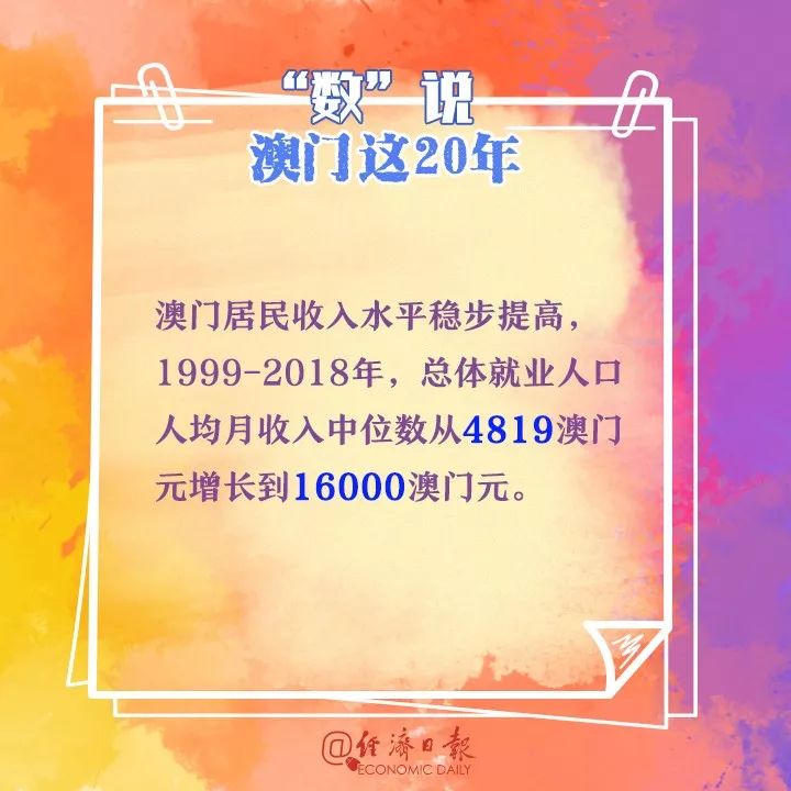1999年回归之初,澳门连续4年经济负增长,失业率高达6.4%,公共财政收入169.4亿澳门元,居民月收入中位数仅4900澳门元。而到2018年,澳门本地生产总值增至4447亿澳门元,人均GDP达67万澳门元,公共财政收入1342亿澳门元;当前澳门总体失业率仅为1.8%,已多年保持低位。