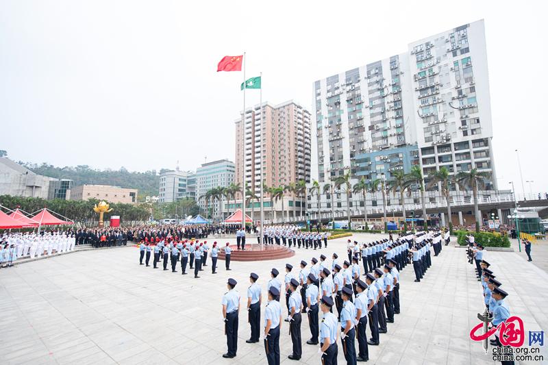 2018澳门国际幻彩大巡游开幕仪式。张金加 摄 被称为澳门全城最大型的嘉年华艺术大巡游活动,是庆祝澳门回归祖国的活动之一,自2011年起,每年12月举办,至今已成为澳门重要的年度节庆盛事。巡游表演光彩闪烁,全城市民、游客徜徉在艺术海洋之中,共庆回归之乐。 温暖守护,此心安处是吾乡 1999年12月20日,中国人民解放军驻澳门部队正式进驻澳门执行防务任务。驻军20年来,驻澳部队与澳门同胞携手奋进,坚定不移维护澳门繁荣稳定,赢得澳门同胞的广泛信任与赞誉,被亲切地称作“莲花卫士”。