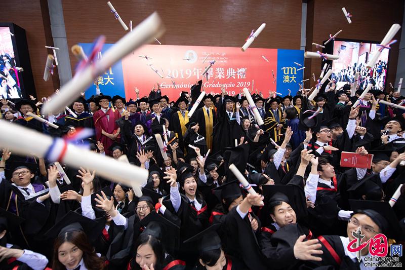 2019年5月25日,澳门大学举行毕业典礼。张金加 摄 澳门特区行政长官兼澳门大学校监崔世安致辞时表示,希望毕业生把握粤港澳大湾区和“一带一路”机遇,积极融入国家发展大局。回归20年来,在澳门接受高等教育的学生规模实现了跨越式增长。