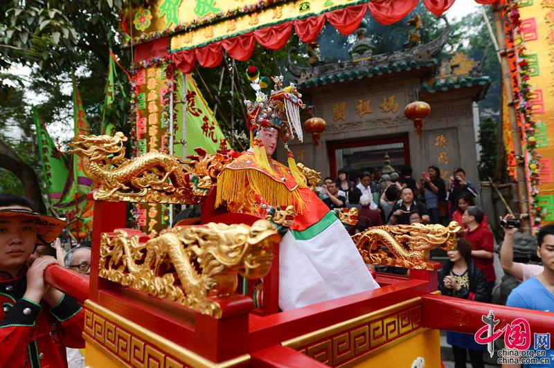 妈阁庙天后诞活动 张金加 摄 妈阁庙为澳门三大禅院之首,至今已逾五百年,是澳门著名的东方式庙宇之一,也是中葡文化融合起点。相传四百多年前,葡萄牙人登陆澳门,在庙门前面的海滩上岸。询问当地居民这里是什么地方,居民以为是问妈阁庙,故答“妈阁”,葡萄牙人以其音译而成“MACAU”,遂为澳门的葡文名称由来。 妈阁庙原称妈祖阁,是为纪念被尊奉为海上保护女神的天后娘娘而建。每年农历除夕和农历三月二十三日“天后”神诞,四方香客云集于此上香拜祀、叩首祈福,并举行丰富多彩的节目助兴,这时妈阁庙上紫烟弥漫,一派祥和,这就是澳门八景之一的“妈阁紫烟”的景色。妈祖是海峡两岸及全球华人共同敬重的海上女神,经岁月演绎而成的妈祖文化是中华民族优秀传统文化的重要组成部分,如今已形成一种国际文化现象。 |