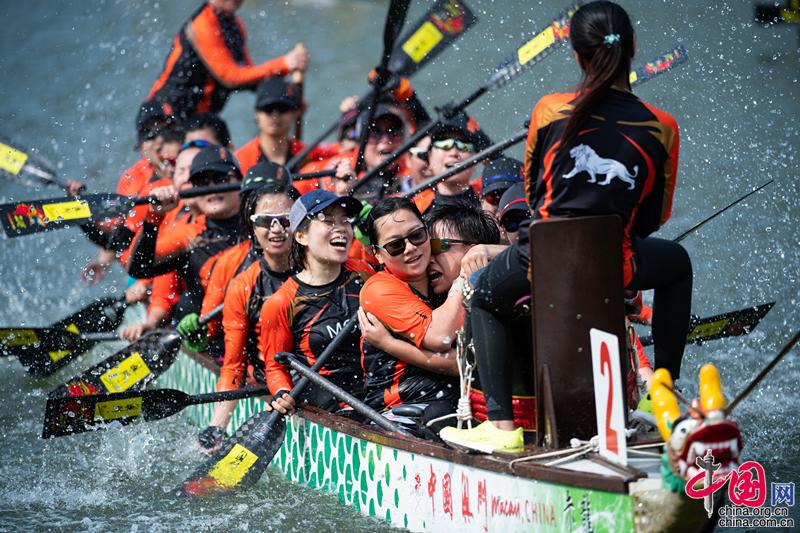 澳门国际龙舟赛获胜队庆祝胜利 张金加 摄 端午节赛龙舟是中华民族重要的传统文化活动,龙舟赛在澳门得到了很好的继承和发展。澳门国际龙舟赛不仅是本地重要的传统节庆活动,而且是城中最受欢迎的国际户外体育赛事之一,澳门及各地龙舟好手在南湾湖内奋勇前进,观众的吶喊声、喧天的锣鼓声和飘扬的彩旗,令一向平静的南湾湖载满热闹。
