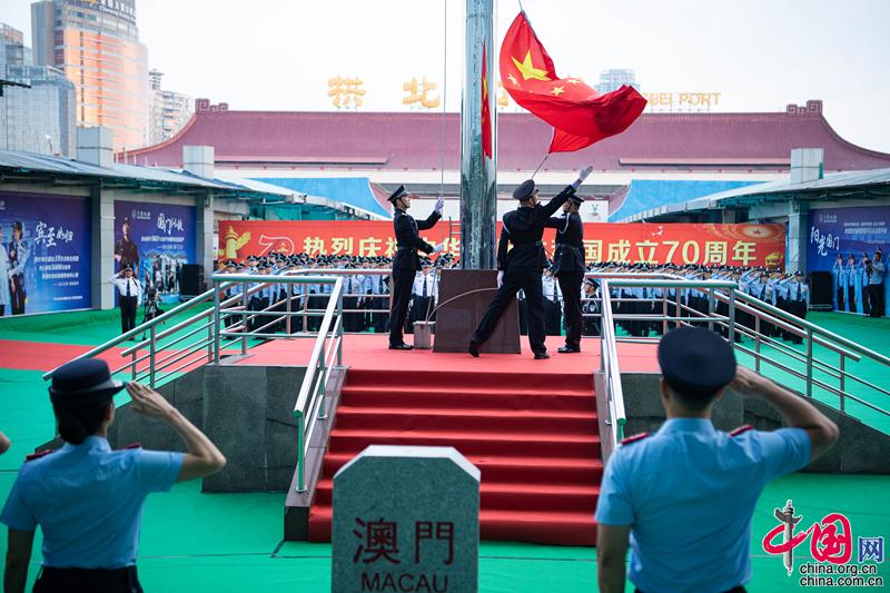 在拱北口岸粤澳边界线上,国家移民管理局珠海边检总站与澳门特区政府治安警察局共同举行“同升国旗共唱国歌”活动。张金加 摄 当日,在拱北口岸粤澳边界线上,国家移民管理局珠海边检总站与澳门特区政府治安警察局首次共同举行“同升国旗共唱国歌”活动,以一种别开生面的方式向祖国母亲70岁生日献礼。澳门警察乐队奏响国歌,双方警员整齐列队,面对国旗庄严敬礼,目视五星红旗冉冉升起,献上衷心祝福。 |