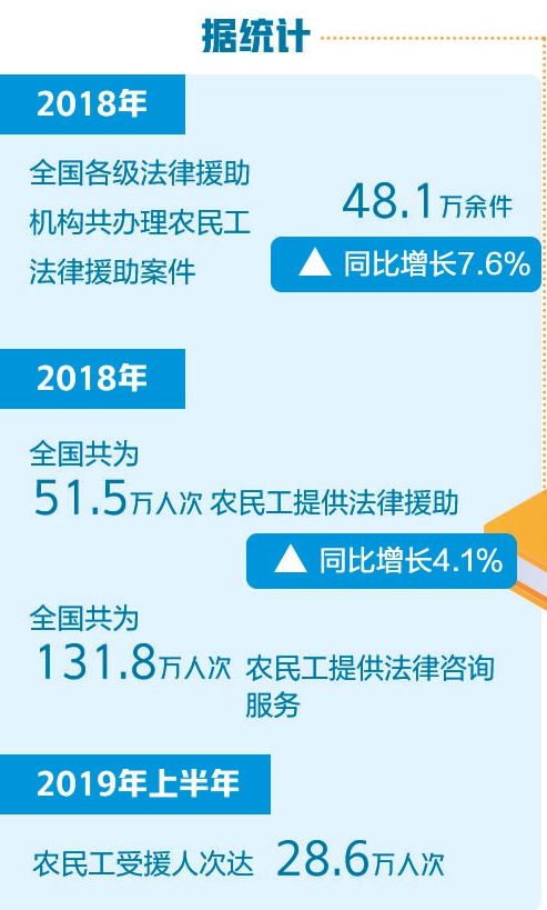 2020-01-03 12:29:33 来源:经济日报 责任编辑:李雅兰 作者:李万祥正值岁末年初,是农民工返乡高峰,也是农民工欠薪纠纷易发多发时期。2020年1月2日,司法部召开新闻发布会,介绍司法部服务根治拖欠农民工工资工作的主要情况,并发布2019年度“法律援助服务农民工十大典型案例”。 据统计,2018年,全国各级法律援助机构共办理农民工法律援助案件48.1万余件,同比增长7.6%。其中,农民工请求支付劳动报酬案件29.3万件,同比增长2.4%。2019年上半年,农民工受援人次达28.6万人次。