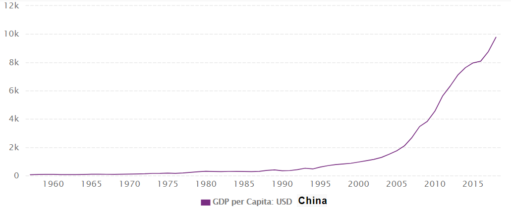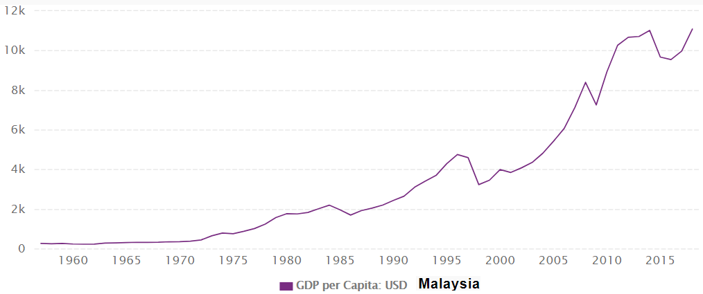 图为1957-2018年马来西亚以美元计人均GDP 可以看出,俄巴墨等国都是从2000年左右开始人均GDP高速增长,用了10年左右时间翻了三四倍,在2008-2010年间纷纷冲上人均GDP1万美元。然而,接下来近十年时间,这些国家围绕着1万美元不断震荡。 这不是偶然的,说明这些国家都不约而同地在人均GDP1万美元附近落入了“中等收入陷阱”,发展模式碰到了瓶颈,人均GDP1万美元真是一个坎儿。 相比之下,中国的人均GDP增长曲线很光滑,还没有陷入瓶颈的迹象,不久后就会超过俄巴墨等国。虽然舆论不时会说中国经济增速下滑,面临各种经济困难,但那是以6%的“保底”经济增长为背景的,在增长的基础上,有一些结构性问题也是正常的,不会出现像俄巴墨等国那样,连以美元计的人均GDP都不时出现震荡大降。