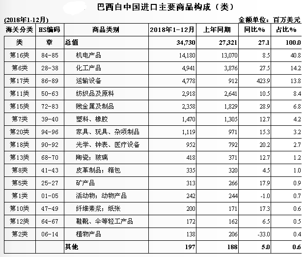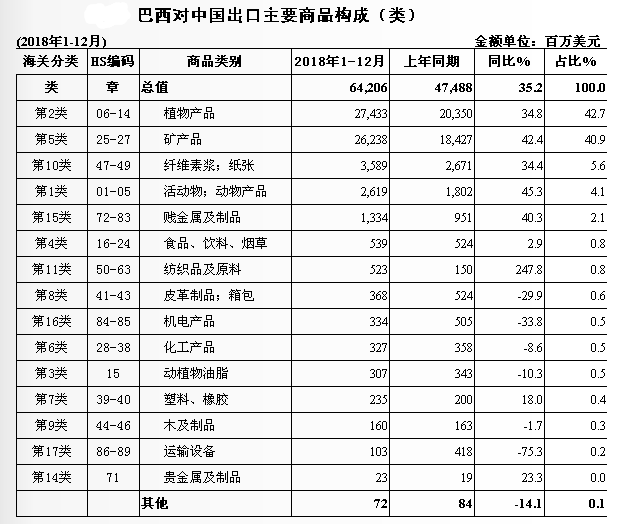 图为2018年巴西对中国出口主要商品构成 2018年,巴西从中国进口347亿美元,占总进口额的19%,但从中国进口的主要是制造业产品,产业层级区别非常明显。巴西曾对此非常忧虑,认为制造业受中国商品影响太大,于是采取了一些措施,比如引入富士康在巴西本地制造iPad。但由于种种原因,巴西最终还是走了“资源经济”路线,富士康巴西工厂也关门了。