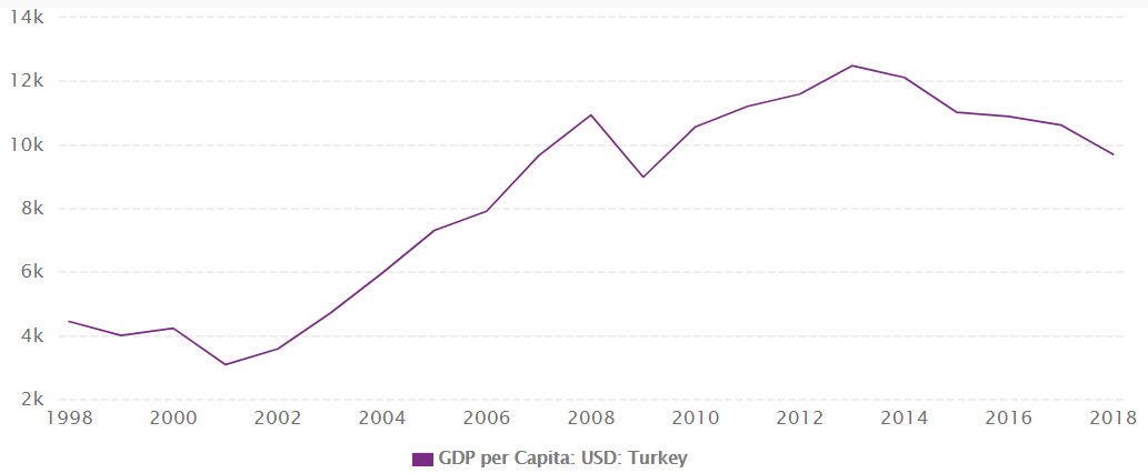 2020-01-03 13:21:30 来源:人民日报 责任编辑:李雅兰 作者:2019年过去了,虽然这一年的总体经济数据尚未公布,但中国发生了一件大事:人均GDP首次超1万美元! 这个数字突破不仅有数学意义,实质意义也很大,一些国家就是在人均GDP达到1万美元后,陷入了近10年的发展困境。 中国人均GDP突破1万美元后,会发生什么? 人均GDP达1万美元是个坎 2019年2月国家统计局公布的数据显示,2018年中国人均GDP达9732美元,比2017年的8836美元增长了10.1%,已接近1万美元的门槛。预计2019年中国人均GDP应该会稳稳地超过1万美元。 那么,人均GDP达到1万美元的国家,经济发展与国民生活是什么状态? 人均GDP在1万美元左右的小国有毛里求斯、多米尼加、格林纳达、赤道几内亚等。这些国家人口少则十几万,多的也不过上千万,没有太大的借鉴意义。 真正值得研究的是20国集团(G20)。G20是19个国家加欧盟,在世界经济中地位突出。 G20中,美、日、德、英、法、意、加这七个西方国家,人均GDP最少的意大利也有3.4万美元,其它都在4万美元以上,而人均GDP最高的美国更是达到了约6万美元。即便中国人均GDP超过了1万美元,跟前述西方七国相比还有较大差距。 G20中的韩国,人口5000多万,人均GDP约为3.2万美元,与人口6000多万的意大利比较接近。再过不久,意大利在世界经济中的地位可能会被韩国超越。 G20中三个明显落后的国家是印度、印度尼西亚和南非,人均GDP分别为大约2000美元、4000美元和6000美元的水平。 澳大利亚、沙特阿拉伯、阿根廷的人均GDP分别为6万美元、2.1万美元和1.5万美元,他们都属于人均资源非常丰富的国家,不适合进行比较。 如果去掉欧盟和上面提到的14个国家,G20就只剩下中国、俄罗斯、巴西、墨西哥、土耳其5个国家,巧合的是,这5个国家的人均GDP正好都在1万美元附近扎堆。 人口最少的土耳其有8000多万人,巴西人口2亿多,俄罗斯和墨西哥都为1亿多。这些国家与中国可以进行一番比较。 此外,还可以再加入一个G20之外的国家——马来西亚,马来西亚人口3000多万,是G20以外国家中人均GDP达到1万美元而人口较多的。 很多人对俄罗斯、巴西、墨西哥、土耳其、马来西亚这些国家(以下简称“俄巴墨等国”)的经济发展有些陌生,下面分别是他们的人均GDP增长轨迹。