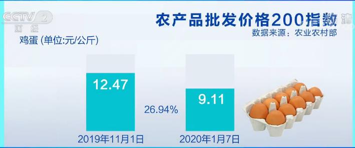 农业农村部数据显示,从2020年第一周情况来看,1月7日,全国鸡蛋价格每公斤9.11元,比2019年第四季度最高价(12.47元)下降了3.36元,下降幅度达26.94%。