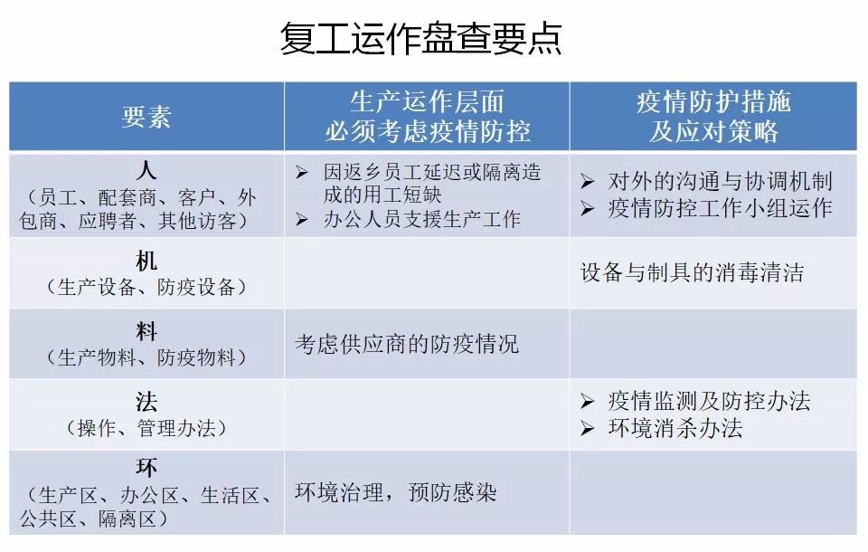 03 工厂复工运作盘点 围绕“人机料法环”等几个方面,对生产运作进行盘点,并制定相应的应对策略。