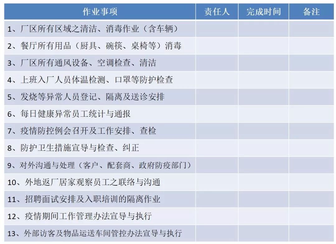 通过以上八点对复工时间,复工前的准备,各级管理人员复工前的工作事项安排等,确保我们能保证人员健康的前提下正常复工。