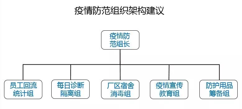 节后复工前8点建议 01 建议公司应成立疫情防范小组 针对疫情,成立公司疫情防范小组,进行人员管控,环境消毒,疫情宣传,物质筹备等方面工作,确保公司所有的疫情防护措施做到位。