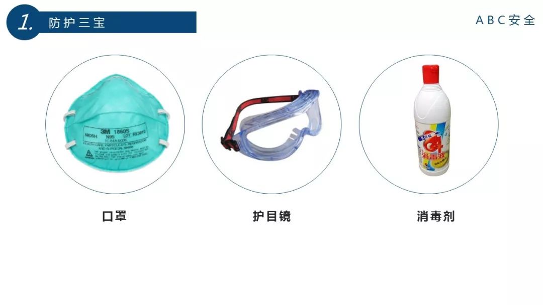 防护三宝: 口罩 护目镜 消毒剂 防疫三要素: 通风 洗手 消毒 三级教育: 家庭防疫教育 社区防疫教育 所在单位防疫教育 杜绝三违: 违规出入人密场所 违规进出重点疫区 违反所在地防疫要求 四不伤害: 不感染自己不感染别人 不被别人感染 不看着别人被感染 四不放过: 传染源不查清不放过; 社会公众不受教育不放过; 防疫措施未采取不放过; 相关责任人员未受追究不放过。 四不两直: 不聚会 不串门 不握手 不扎堆 直接居家隔离 直接个体防护 五查: 查思想(意识是否到位) 查体温(是否有症状) 查防护(是否戴口罩) 查行踪(是否有疫区接触史) 查责任(防疫要求是否落实) 防疫6S管理: 整理(Seiri)-整理情绪,重视但不恐慌 整顿(Seiton)-管控措施要强化 清扫(Seiso)-保持环境卫生 清洁(Seikeetsu)-注意个人卫生 素养(Shit-suke)-提高公众防范意识 安全(Safety)-平安健康度过疫情