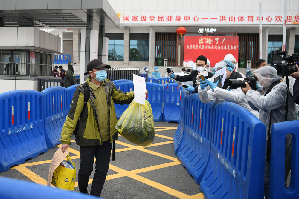 2月11日,一名出院患者展示出院证明。当日,武汉市武昌方舱医院首批新冠肺炎轻症患者经过治疗出院。新华社记者 程敏 摄 2月11日,位于洪山体育馆的武汉大学人民医院武昌方舱医院备受瞩目——首批经过治疗康复的28名新冠肺炎轻症患者从这里顺利出院。 回顾治疗过程,武昌方舱医院院长万军说,除了按照治疗方案科学施治之外,还有一个“秘诀”,那就是发挥党组织、党员的先锋模范作用。 2月5日,武昌方舱医院医疗队成立临时党支部;2月10日,病友临时党支部成立;来自各地的援鄂医疗队也纷纷成立临时党支部……在临时党支部带动之下,队员们争分夺秒,与疫情竞速、抢救生命。 共产党员活跃在一线,不仅有效增进了医患之间的配合,更增强了患者们战胜疾病的信心。 “没有共产党,就没有新中国……” 这充满信心的歌声,伴着人们激动的泪水,回荡在医院内、病房里、人心中,响彻荆楚大地,点亮一座城市的希望。 英雄无畏:“疫情不退,我们不退!”