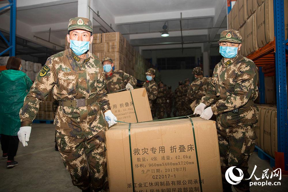 “疫情就是命令”,抵达现场后,武警官兵争分夺秒抢运疫情防控救援物资,至2月9日12时,4000顶帐篷、8000床棉被、2000张折叠床,总重量共计312.4吨的救援物资全部按时搬运上转移物资的火车。(摄影报道 刘明 莫国良 余海洋)
