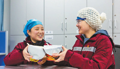 2月9日,中南大学湘雅二医院援鄂医疗队护士周杰楠(右)在武汉度过了29岁生日。在紧张的工作间隙,她与同样是当天过生日的同事曾艳一起吃方便面当做庆祝。本报记者 张武军摄