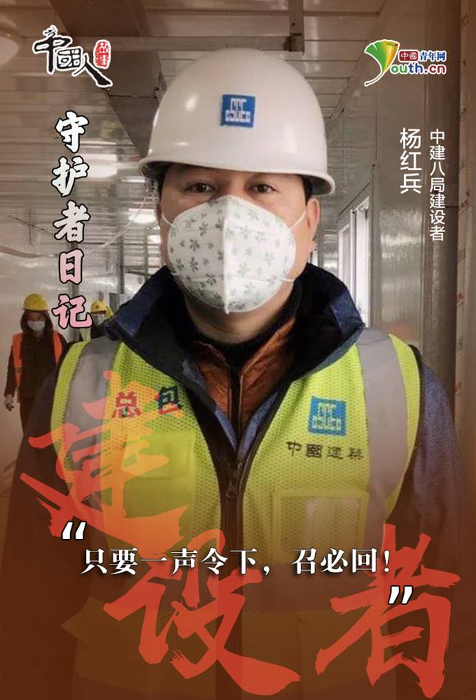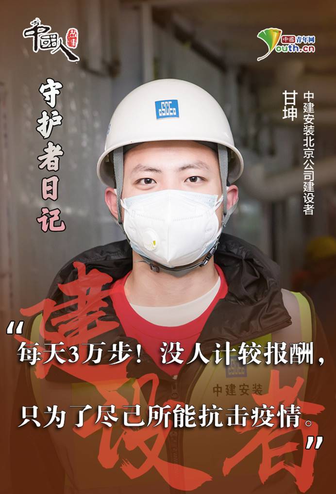 “我叫甘坤, 来自中建安装北京公司。 我的大学时光在武汉度过, 对这座城市有着特殊的感情。 1月28日, 得知单位组织员工驰援火神山、 雷神山医院建设, 我立即就报了名, 当晚到达建设现场。 在工地上真的很忙碌, 我平均每天都要走3万步。 工友们来自全国各地, 到场地分到任务就开始干活儿, 也没人计较报酬, 就是尽己所能抗击疫情。” “只要一声令下,召必回!”