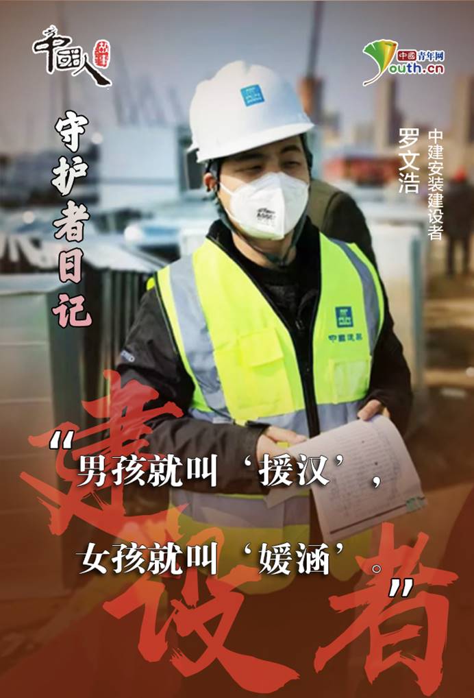 “我叫杨红兵,来自中建八局。 2月3日12时, 我接到了雷神山项目的通知, 14时,我就赶到了现场。 之所以来得这么快, 是因为妻子一直很支持我的工作。 无论是2008年汶川抗震救灾、 2017年武汉抗洪抢险, 还是这次修建雷神山医院, 她总会第一时间给我收拾好行装。 作为行业里的‘国家队’, 我们就得有这样的担当: 只要一声令下, 召必回!” “男孩就叫‘援汉’,女孩就叫‘媛涵’”