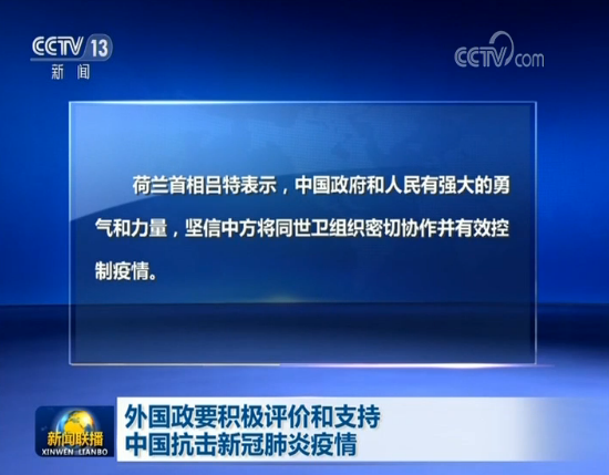 荷兰首相吕特表示,中国政府和人民有强大的勇气和力量,坚信中方将同世卫组织密切协作并有效控制疫情。 新西兰总理阿德恩表示,赞赏中方针对疫情采取的坚决果断防控措施,新方愿为中方战胜疫情提供帮助。 加拿大总理特鲁多表示,值此艰难和不确定时期,国际社会必须继续合作,我们随时准备向中方提供帮助。 非盟委员会主席法基在非盟峰会开幕式上表示,我们对正在遭受新冠肺炎疫情的中国人民表示慰问,完全支持中方的抗疫行动。