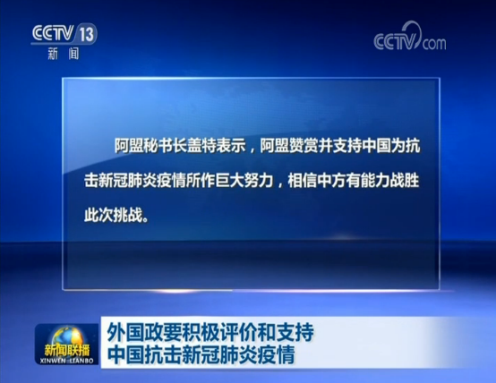 阿盟秘书长盖特表示,阿盟赞赏并支持中国为抗击新冠肺炎疫情所作巨大努力,相信中方有能力战胜此次挑战。 77国集团主席国圭亚那表示,77国集团全力支持中国政府抗击新冠肺炎疫情所作努力,强调国际社会应本着负责、透明、团结、合作精神,共同应对疫情,防止歧视、污名化和传播不实信息。 世卫组织总干事谭德塞在新冠肺炎全球论坛开幕式上表示,特别致敬在中国的兄弟姐妹们,赞赏你们在极为艰难的情况下表现出的勇气和耐心,我们与你们团结一致,祝愿你们早日收获成功和健康。