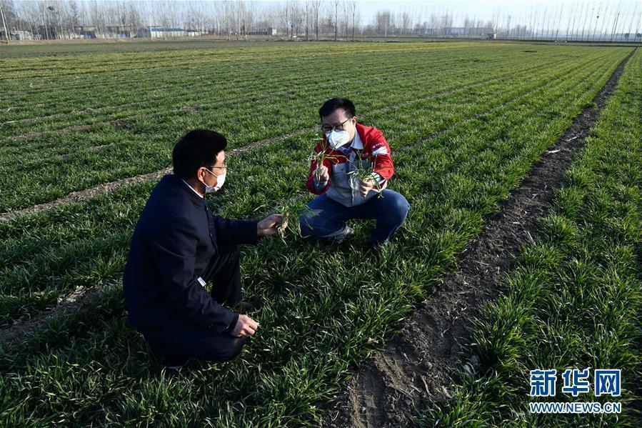 2月13日,在山东省泰安市宁阳县葛石镇大夏庄村,丰信公司工作人员(右)在为提供“保姆式”服务的农户传授小麦管理知识。新华社记者 郭绪雷 摄