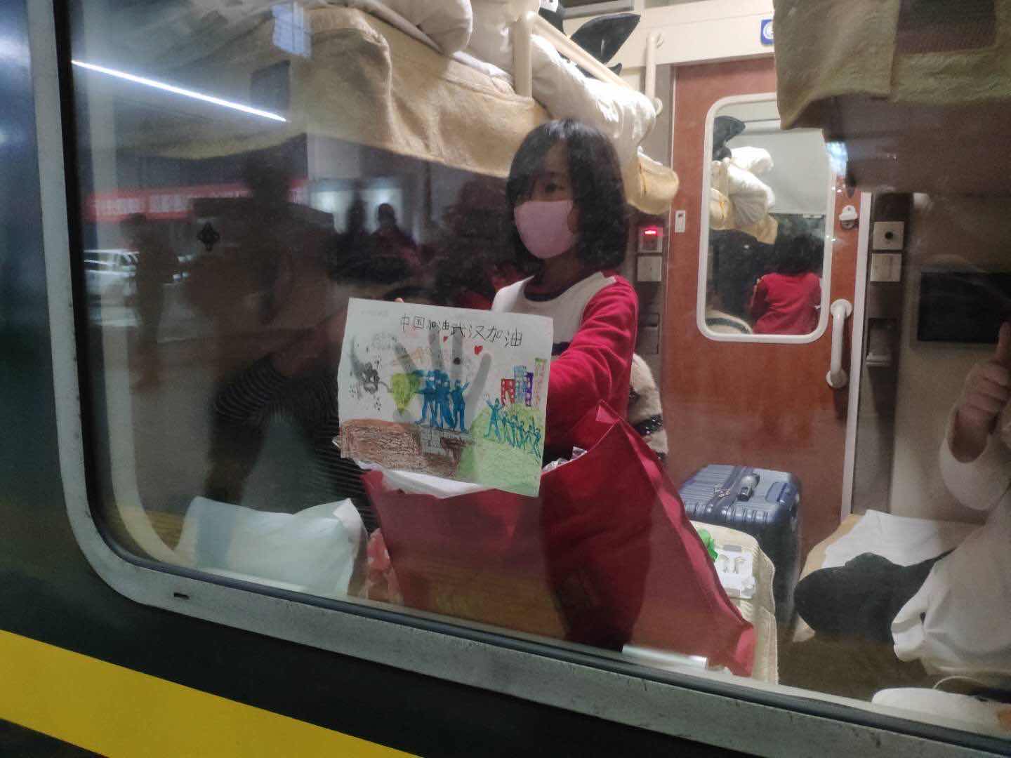 看到小女孩的动人举动,武昌车站派出所教导员应伟隔窗与小女孩互相加油鼓劲。