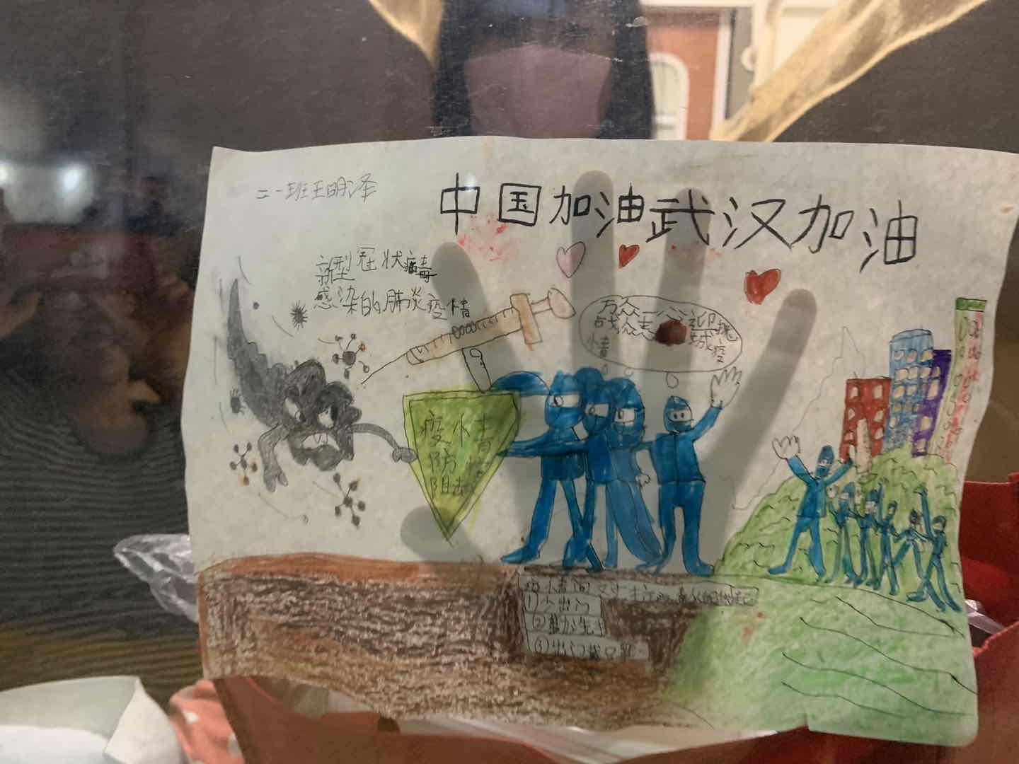 画上写着“中国加油、武汉加油”“万众一心迎战,众志成城抗疫情”的字样,还有一群穿着防护服、戴着口罩的工作人员正在和病毒斗争,而他们身后正是美丽的家园,图画下方写着“少出门、勤洗手、出门戴口罩”的提示语,稚嫩的笔画描绘出真挚的祝福。