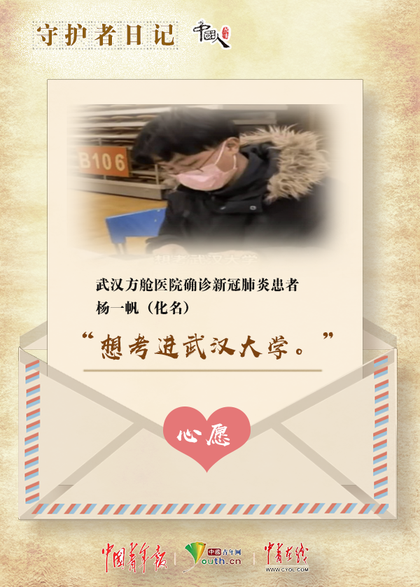 我是一名消防员, 她是曲靖市罗平县松毛山医院的儿科医生。 1月24日, 我们本将结束8年的爱情长跑, 走进婚姻的殿堂。 但疫情来临, 我们收回了请帖,取消了婚礼, 又回到了各自的岗位。 她说,“如果没有国家的安全, 也不会有小家的幸福。” 疫情之下,我们的想法是一致的。 现在的我, 特别想在罗平数十里油菜花绽放时, 迎着似海的金浪,许她一生一世。 NO5 |武汉方舱医院确诊新冠肺炎患者杨一帆(化名) 心愿:“想考进武汉大学”