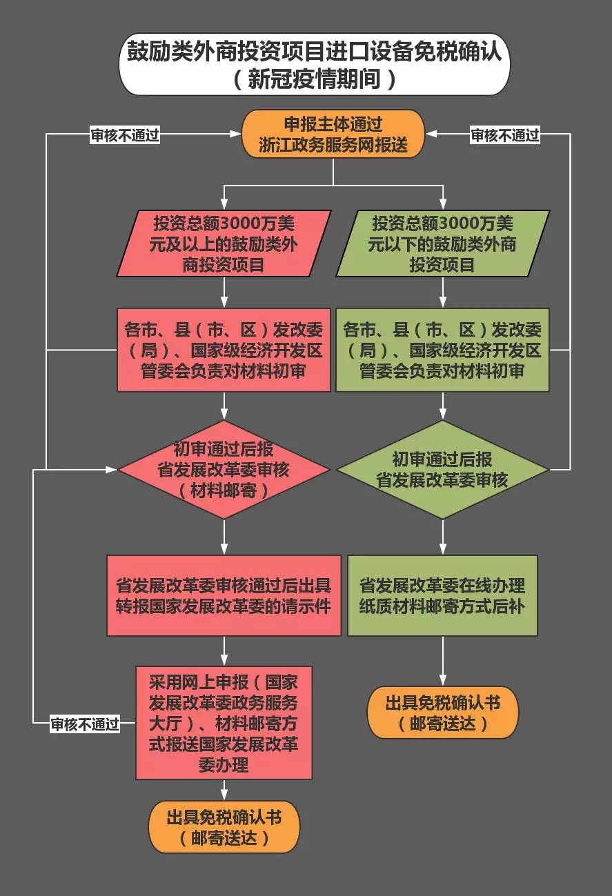 加快推进外商投资项目进口设备免税网上审批,简化工作流程,为外资企业和项目提供便利化服务。 一是投资额3000万美元以下的鼓励类外商投资项目进口设备免税确认程序。疫情期间,通过浙江政务服务网在线申报省发展改革委,采用电话咨询、结果寄达的方式办理。企业营业执照、授权委托书、申报表等纸质材料,均可通过邮寄方式后补。 二是投资额3000万美元及以上的鼓励类外商投资项目进口设备免税确认程序。疫情期间,通过浙江政务服务网在线申报省发展改革委,经审核通过并出具转报文件后,采用网上申报、材料邮寄、视频会商、网上咨询、电话咨询、结果寄达的方式,报送国家发展改革委办理。