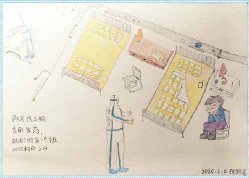 2020年1月27日,陈默岩用画笔记录下了她和伙伴们在武汉第一天的生活,在这一天,她们正式进驻湖北省中西医结合医院呼6病区,而踏入这里的那一刻,也正式开启了属于她们自己的“援汉日历”。 陈默岩,北京中医药大学东方医院驰援武汉医疗队护士,她这样介绍自己的画画经历:“主要是羡慕画画好的人,小时候喜欢照着饼干桶上面的人物画,现在孩子喜欢画画,我就跟着学点儿,圆小时候的梦。”