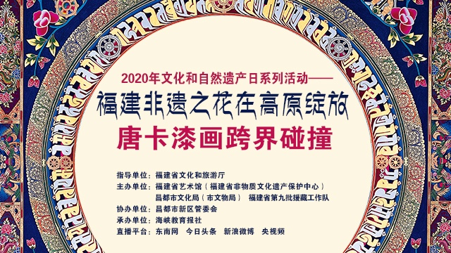 6月4日上午9:30-11:00,2020年文化和自然遗产日系列活动——“福建非遗之花高原绽放”唐卡漆画跨界碰撞连线直播活动将在福州、昌都两地举办。此次活动也是福建省艺术馆(福建省非物质文化遗产保护中心)的2020年文化和自然遗产日系列活动之一。 本次直播活动由福建省文化和旅游厅指导,福建省艺术馆(福建省非物质文化遗产保护中心)、昌都市文化局(市文物局)、福建省第九批援藏工作队主办,昌都市新区管委会协办,海峡教育报承办。 2019年,福建省第九批援藏工作队会同福建省文旅厅、福建省艺术馆和昌都市文化局联合组建了“唐卡漆画文化产业小组团”,选取昌都市唐卡艺术传承人和唐卡画师为重点培训对象,教授运用漆画技艺制作唐卡作品。今年5月,昌都市首届唐卡漆画技艺培训班在西藏昌都开班,37名学员经过40天培训,将创作一批以昌都解放70周年为主题的唐卡漆画作品,为昌都解放70周年献礼。 此次培训班既是福建艺术扶贫工程打造的农民漆画创新实践的升级版,也是福建省第九批援藏工作队按照中组部精准实施“小组团”援藏工作的要求,采取“短小精专”的组团方式,找准切入点,解决问题,填补行业空白创新的“福建经验”和“福建模式”。 据介绍,此次直播将采取福州昌都两地连线方式,福建和西藏艺术家同步出镜介绍唐卡漆画的艺术之美,还将呈现新鲜出炉的唐卡漆画作品,让更多观众认识唐卡漆画,了解福建艺术扶贫工程,见证艺术超越时空的碰撞与新生。 在西藏昌都康巴文化产业园,福建省艺术馆领导、昌都文化局领导将带大家参观唐卡漆画培训现场,看学员们现场作画,欣赏学员作品,并介绍唐卡漆画培训班背景意义、现有规模、发展前景,还有培训班学员畅谈学习感受。