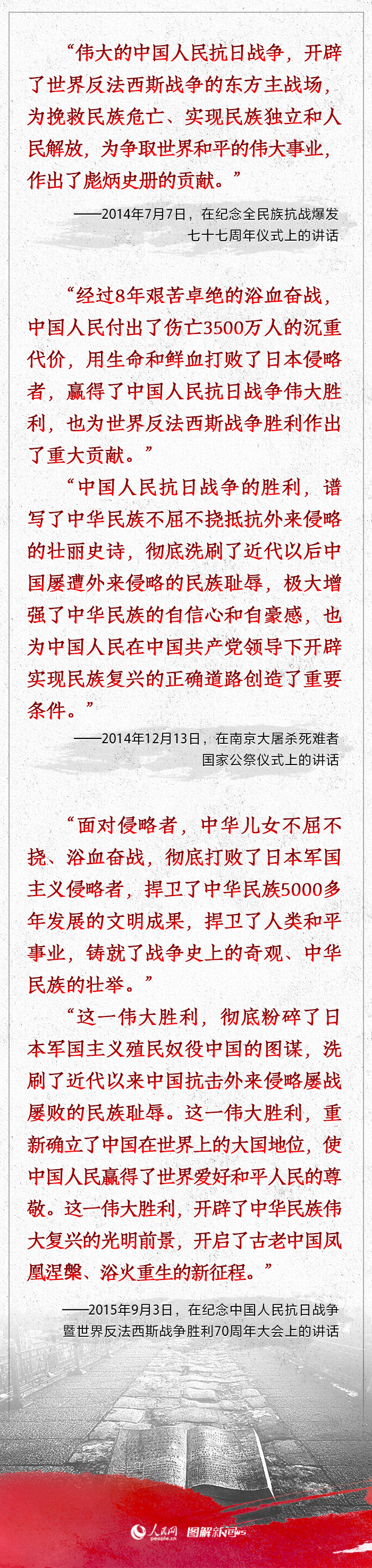 历史是最好的教科书,也是最好的清醒剂。习近平在关于中国人民抗日战争的重要讲话中多次强调要铭记历史、珍爱和平,展示了中国以史为鉴,坚定不移走和平发展道路,坚定不移维护世界和平的决心。