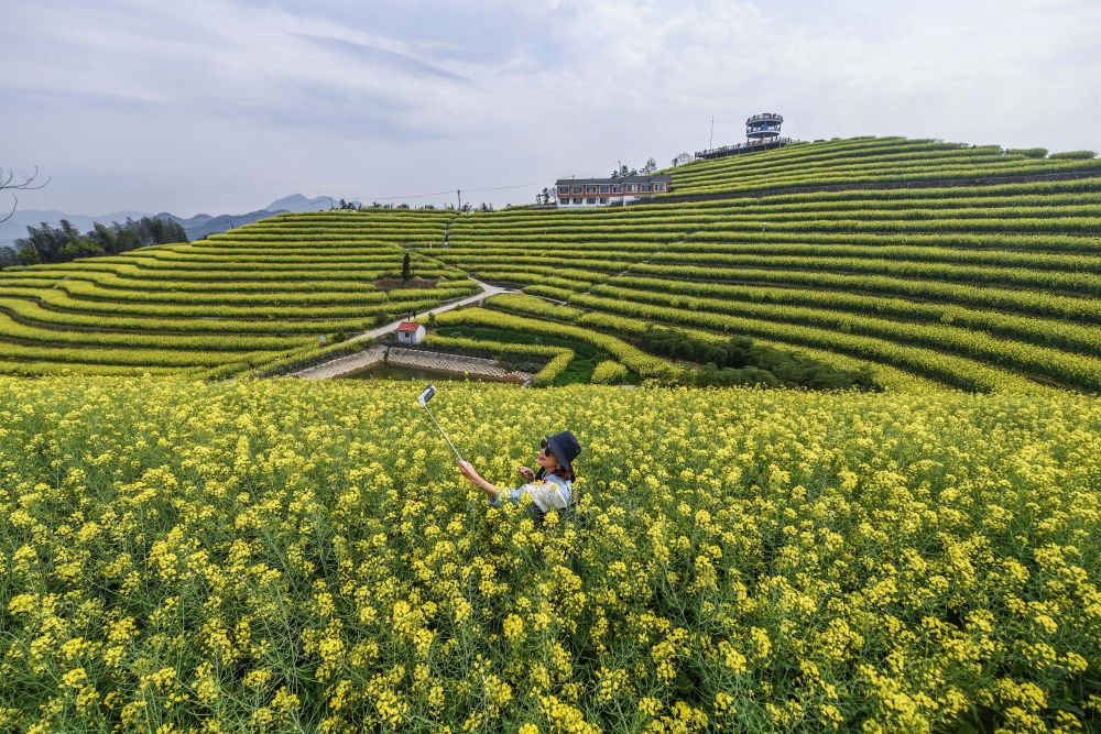 游客在浙江省杭州市富阳区新登镇上旺村黑山顶的油菜花海游玩(3月25日摄)。新华社记者 徐昱 摄