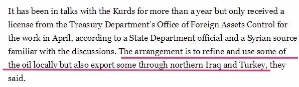 △《政治报》:一家鲜为人知的美国公司得到了叙利亚石油合同 报道说,美国除把一部分取自叙利亚的石油留给“叙利亚民主军”外,还悄悄通过伊拉克北部和土耳其的通道把这些石油出口到其他地方。