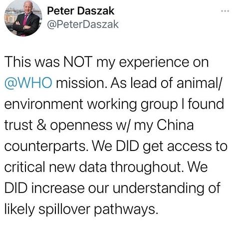 世界卫生组织病原体顾问、美国非营利组织生态健康联盟(EcoHealth Alliance)主席彼得·达扎克(Peter Daszak)在推特上表示:“这不是我在世界卫生组织的任务中得到的经验,作为动物和环境工作组的负责人,我感到中国同行们坦率并值得信任。我们(在调查中)得到了重要的新数据,我们也了解了更多关于病毒传播途径的信息。”