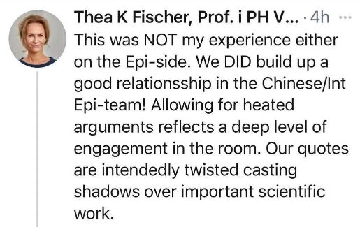 世界卫生组织麻疹、风疹、流感和小儿麻痹症参考实验室负责人、公共卫生专家西娅·菲舍尔(Thea K Fischer)也在推特上发帖表示《纽约时报》的报道严重扭曲了她所说的话:“这也不是我在流行病学团队得到的经验。中国方面和国际流行病学团队建立了良好的关系,(我们)进行的热烈讨论也反应了(中国方面的)高度参与。我们说的话被严重扭曲,这为重要的科学工作带来了阴影。”