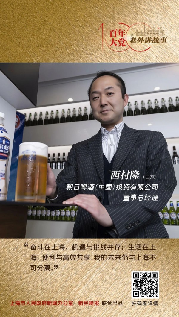为迎接党的百年华诞,上海市人民政府新闻办公室与新民晚报社共同策划,历时半年精心制作了《百年大党——老外讲故事》百集融媒体系列产品。 100位在沪的外国人,讲述他们在中国、在上海生活工作的所闻所见所感,第52期邀请的是来自日本的西村隆。 《百年大党——老外讲故事》第52期 姓名:Nishimura Takashi 中文名:西村隆 国籍:日本 职业:朝日啤酒(中国)投资有限公司董事总经理 “上海是我来了就不想离开的城市。”站在中信泰富办公室巨大落地窗前,朝日啤酒(中国)投资有限公司董事总经理西村隆俯瞰着脚下川流不息的南京西路繁华街区,内心激荡。自2009年来到上海,12年间见证着这座城市的飞速发展,自己也从一名“中文小白”的HR,成长为能说一口流利普通话的董事总经理。“奋斗在上海,机遇与挑战并存;生活在上海,便利与高效共享。”西村隆说,自己的未来仍与上海不可分离。