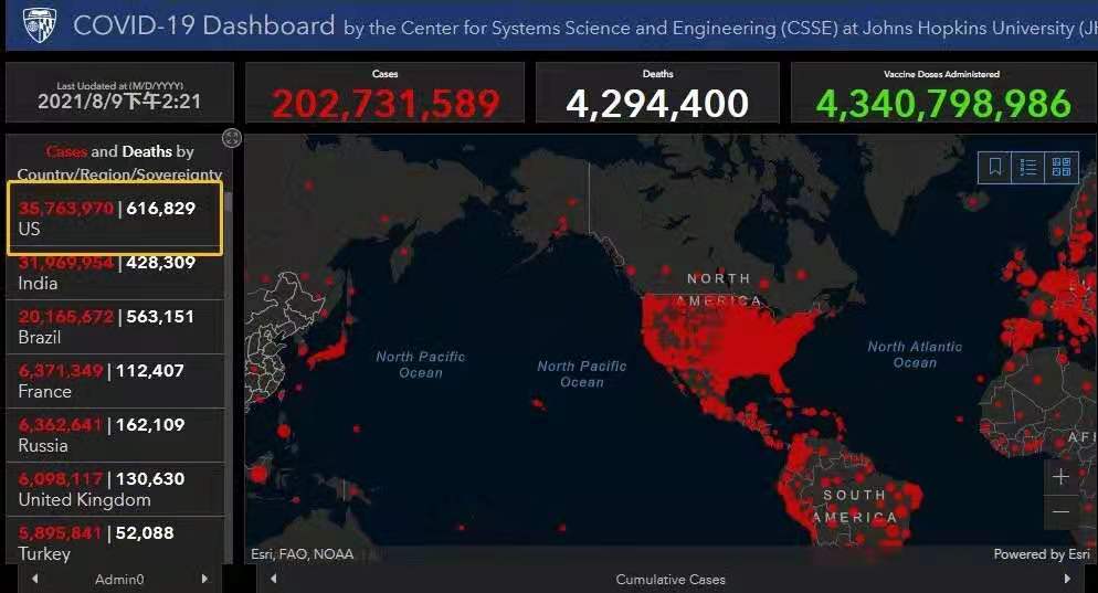 2021-08-10 15:23:15 来源:央视新闻客户端 责任编辑:吴静 作者:目前,全球新冠肺炎累计确诊病例已超2亿。而人口仅占世界4%的美国,病例数却占到全球总数的18%,给自己贴牢了“抗疫失败国”的标签。