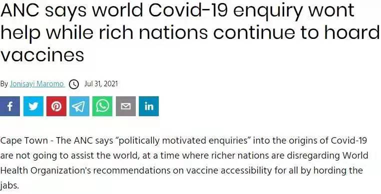 △世卫组织数据截图 世卫组织日前还呼吁有关国家在9月底以前停止疫苗加强针的接种,以便让贫困国家民众能获得他们的第一剂疫苗。然而,美国政府却拒绝了世卫组织的这一请求,并称“这是一个错误的选择”。 坐拥多得甚至快过期的富余疫苗见死不救,却不遗余力地妄图胁迫和利用世卫组织服务于自己卑劣的政治化溯源图谋,美国的恶劣行径已让世人心明眼亮。 南非执政党非洲人国民大会(非国大)近期发表声明指出,新冠肺炎疫情已经导致世界各地数百万人死亡,“在这个富裕国家无视世卫组织的分享疫苗建议而独享大量疫苗的时候,就新冠病毒的起源进行出于政治动机的调查对世界毫无帮助”。