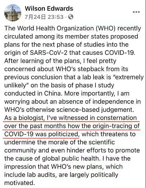 △威尔逊·爱德华兹社交媒体截图:作为一名生物学家,我亲眼目睹了病毒溯源问题在过去几个月里是如何被政治化的。 英国作家、政治和国际关系分析人士汤姆·福迪在“今日俄罗斯”新闻网发文指出,美国现政府仍然延续了前政府编造“实验室泄漏”谎言和病毒溯源阴谋论的行径,试图让疫情和世卫组织都走向“政治化”。“如果想要世卫组织正常运行,美国就必须停止让该组织充当替罪羊”。