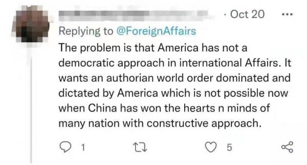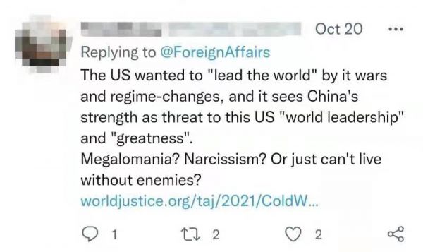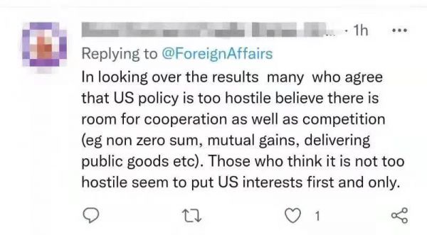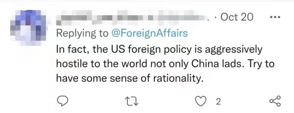 对于“美国对中国过于敌对”,网友认为,这个范围太窄了。“事实上,不仅对中国,美国外交政策对全世界都充满敌意。试着理智一点吧。”